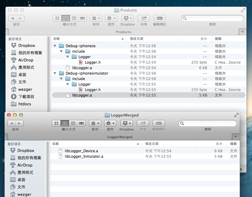 Create a New folder LoggerMerged and copy above .a files. Name them libLogger_Device.a and libLogger_Simulator.a separately.